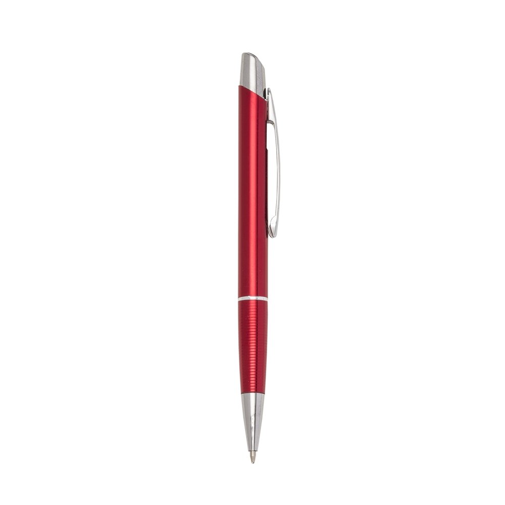 Caneta metálica com carga esferográfica azul e acionamento por clique.