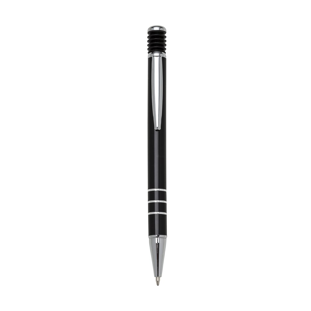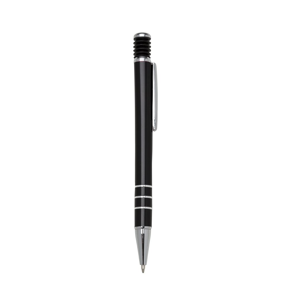 Caneta metálica com carga esferográfica azul e acionamento por clique.