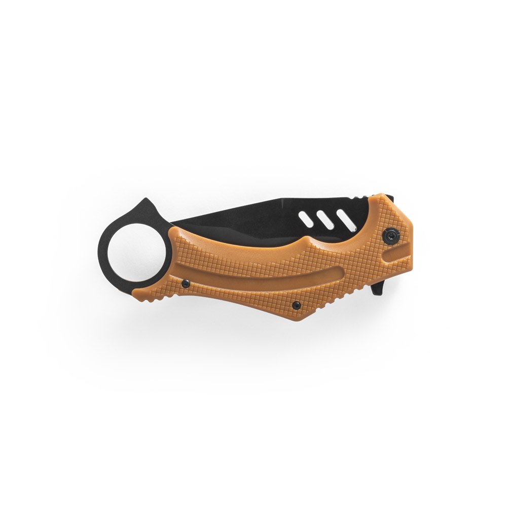Canivete dobrável em aço inox e cabo em plástico. Fornecido em caixa presente de papel kraft reciclado. Aberta: 230 x 40 x 10 mm | Fechada: 140 mm