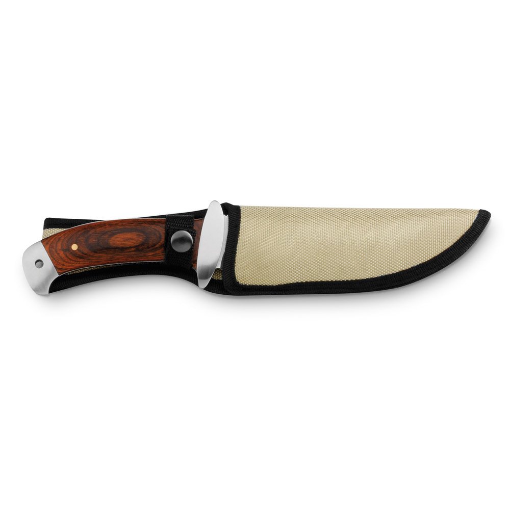 Faca em aço inox e madeira com bolsa de 600D. Fornecido em caixa presente. 300 x 19 x 60 mm