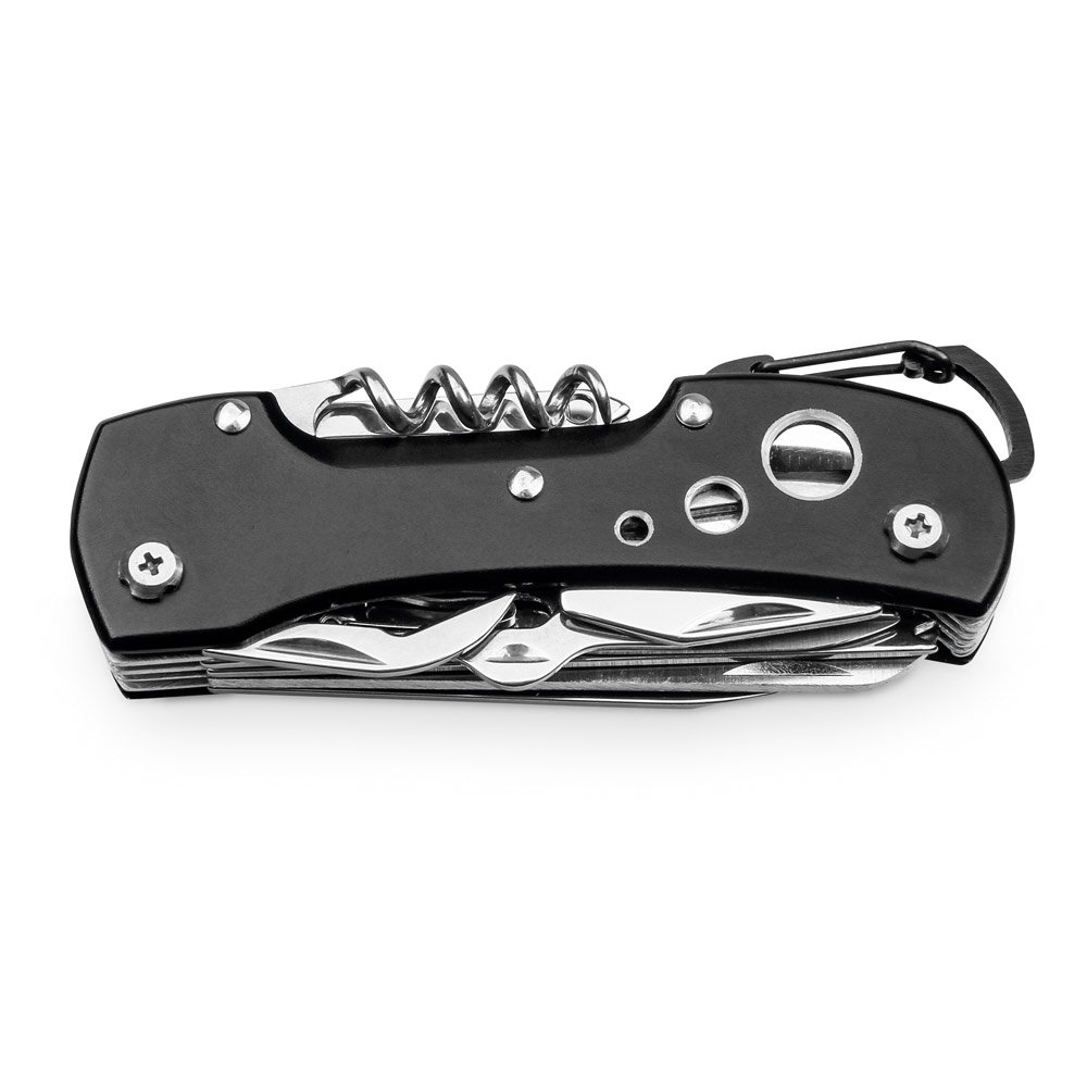 Canivete multifunções em aço inox com 12 peças e mosquetão. Fornecido em caixa presente. 89 x 16 x 32 mm | Caixa: 104 x 39 x 20 mm