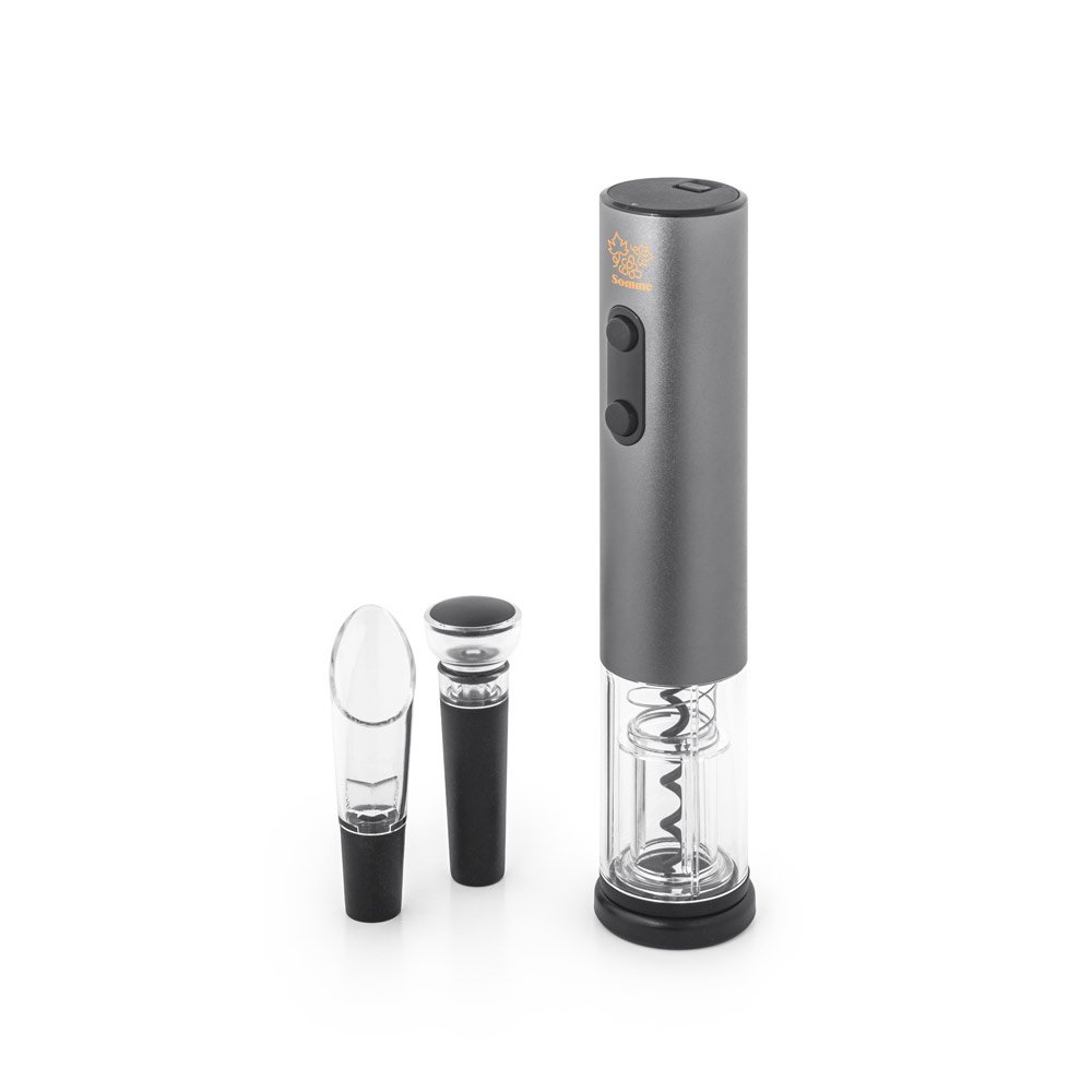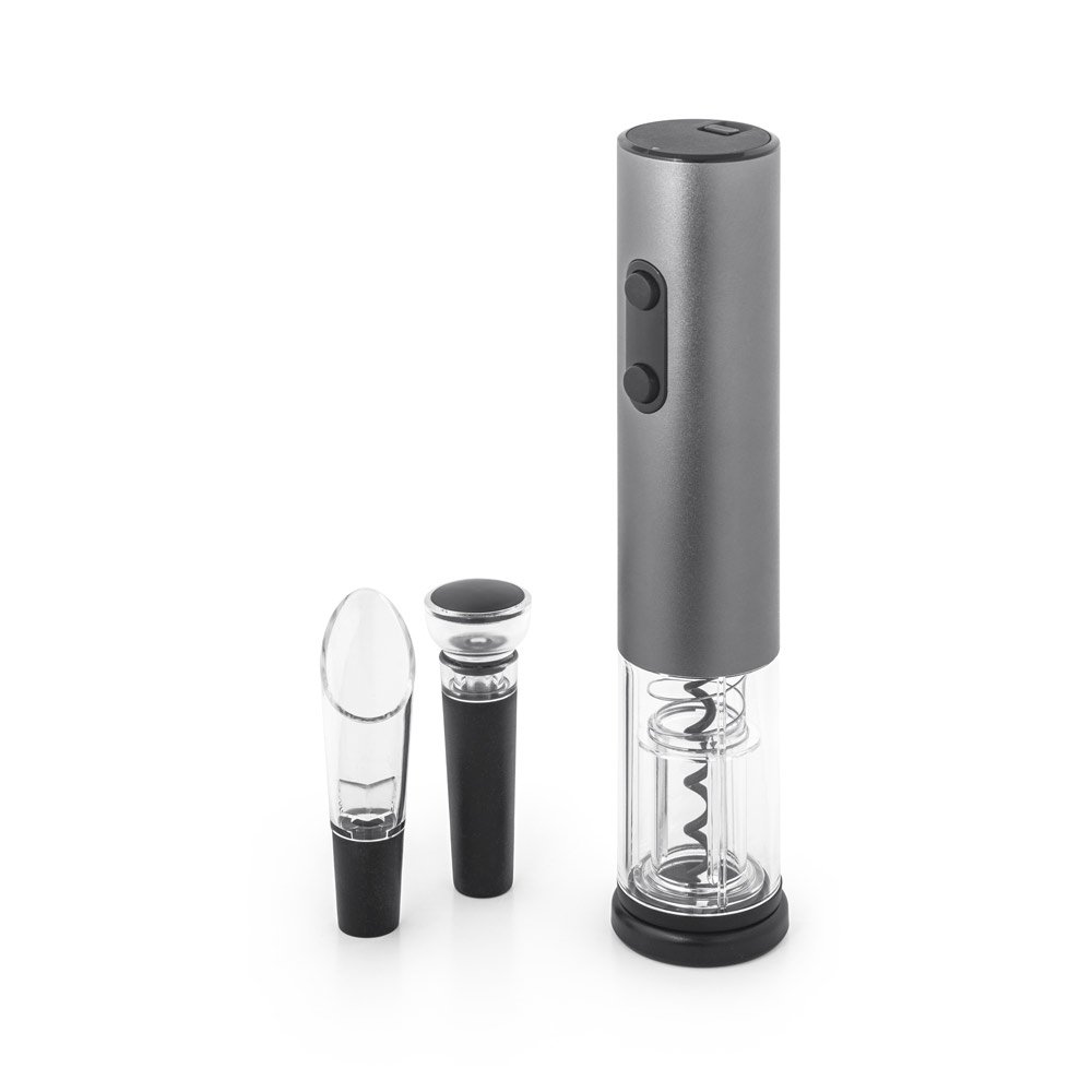 Conjunto de saca-rolhas elétrico em alumínio e acessórios: corta-cápsulas, rolha de vácuo e salva-gotas (pilhas inclusas). Fornecido em caixa presente. Saca-rolhas: 45 x 225 mm | Caixa: 241 x 90 x 54 mm