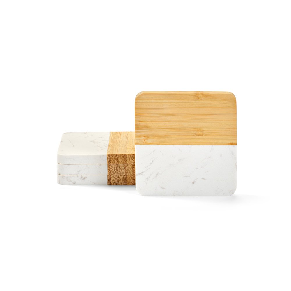 Conjunto de 4 porta copos em mármore e bambu em formato quadrado. Cada peça individual está dividida, pela sua metade, em mármore e bambu. Fornecido em caixa presente em papel kraft reciclado. Certificação EU Food Grade. A cor e o resultado da impressão nos materiais naturais pode variar entre produtos. 100 x 100 x 10 mm