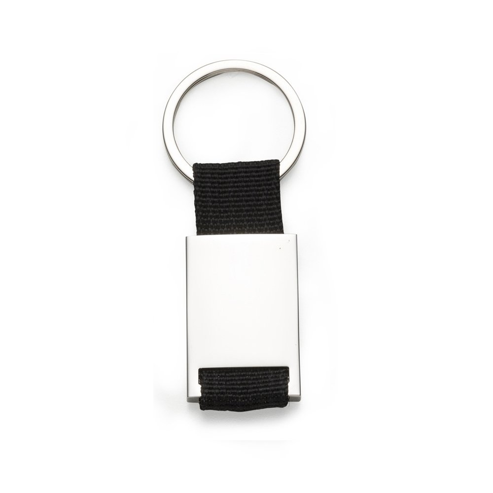 Chaveiro de metal com detalhe colorido em nylon. Metal liso e espelhado de ambos lados.