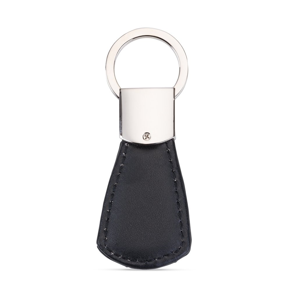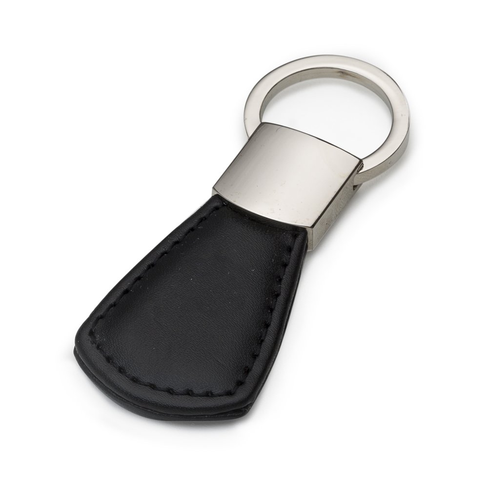 Chaveiro de metal com napa. Verso metal liso e parte traseira com um parafuso, possui uma espécie de mosquetão que ao puxar para cima a argola é possível rotaciona-la.