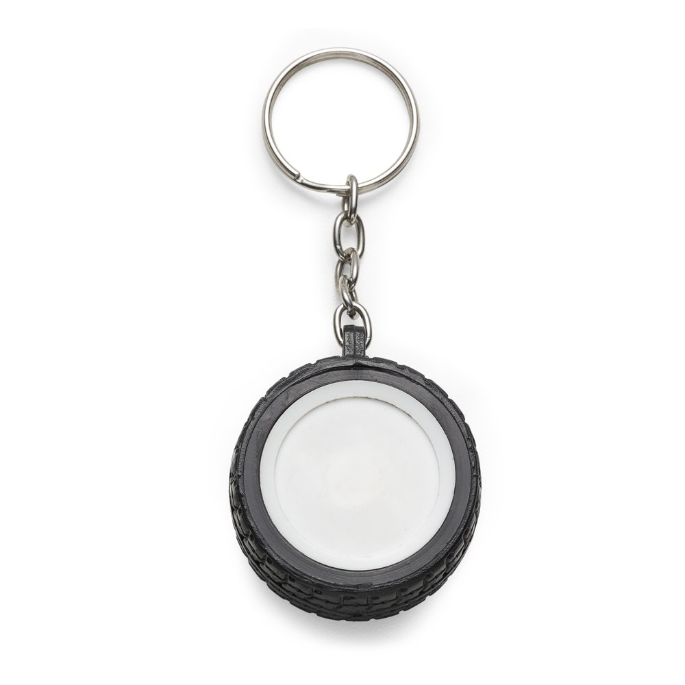 Chaveiro plástico formato pneu, aro detalhado plástico colorido de um lado e lado inverso liso(possível aplicar resina). Pneu emborrachado.