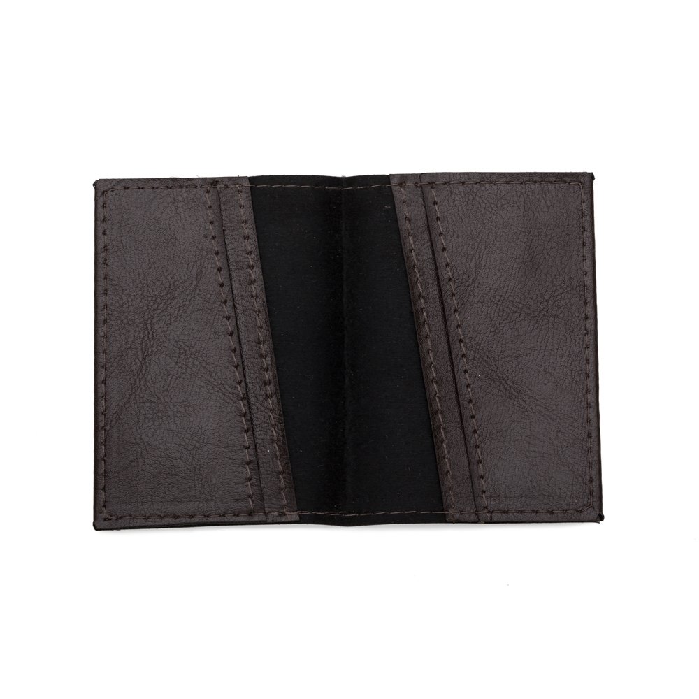 Porta cartão em couro sintético com quatro divisórias em diagonal.