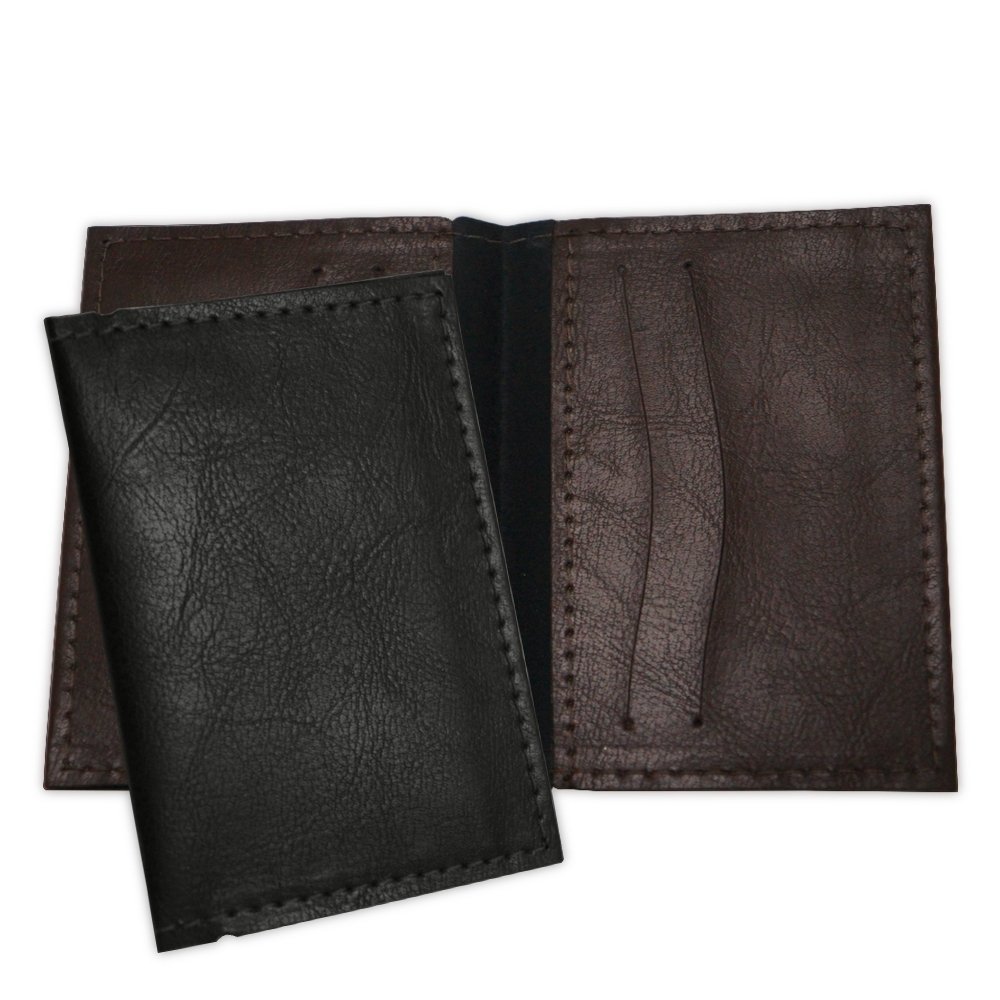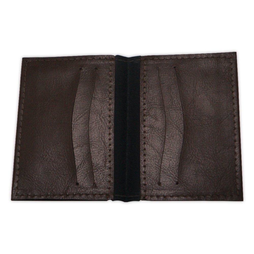 Porta cartão em couro sintético com quatro divisórias e dois bolsos internos.