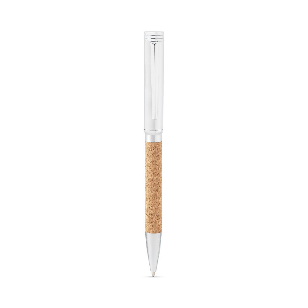 Conjunto composto por uma esferográfica e um chaveiro, ambos em metal e cortiça. A esferográfica tem clipe em metal, mecanismo twist e escrita em azul. Fornecido em caixa presente de papel kraft reciclado. A cor e o resultado da impressão nos materiais naturais pode variar entre produtos. Esferográfica: ø11 x 137 mm | Chaveiro: 20 x 100 mm | Caixa: 70 x 160 x 17mm