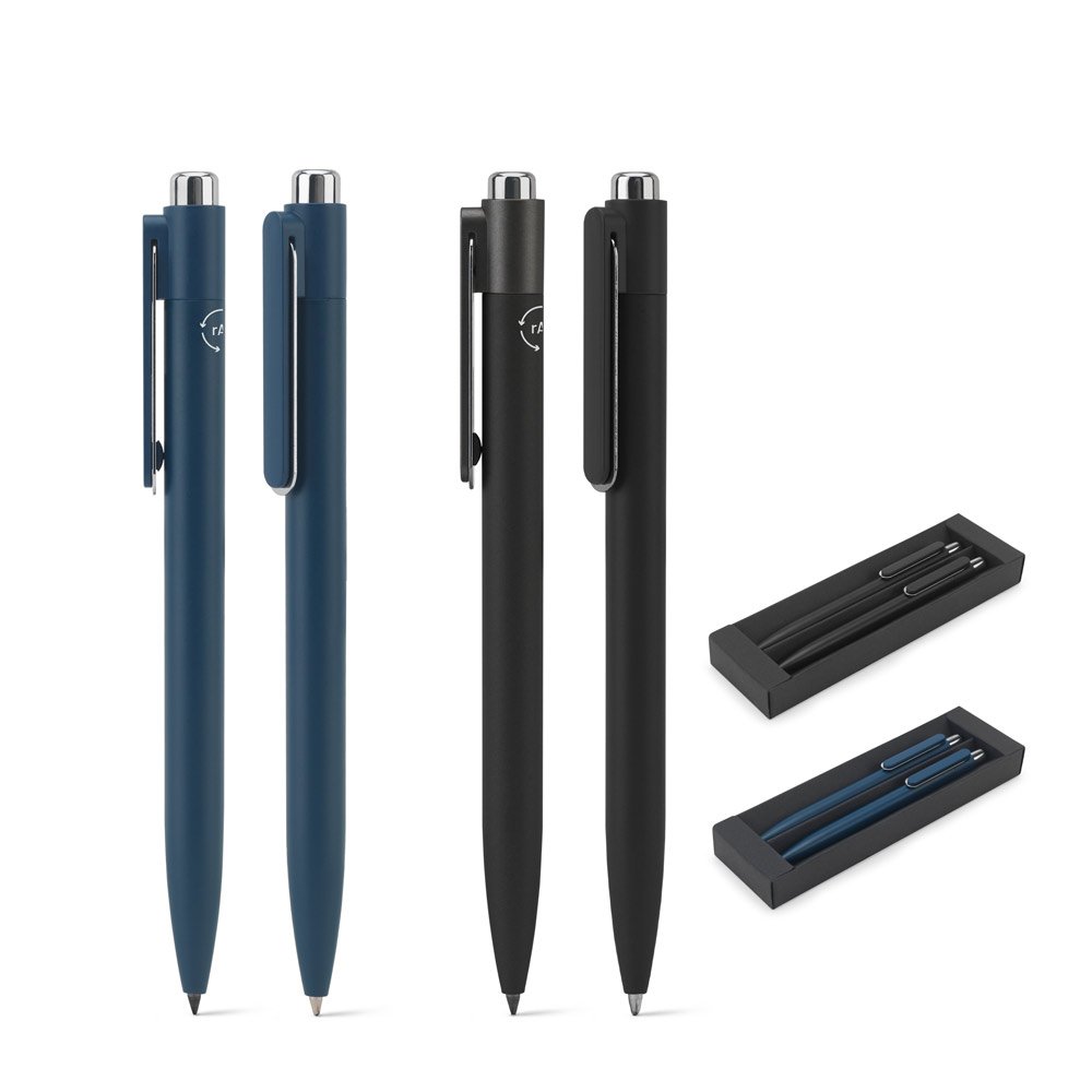 Conjunto composto por uma esferográfica e uma caneta sem tinta, ambas em alumínio 94% reciclado. A esferográfica tem escrita em azul até, 1’5 km e a caneta sem tinta permite um uso prolongado sem a necessidade de apontar. Um conjunto que proporciona uma sensação de escrita suave e fluída. Fornecido em caixa presente de papel proveniente de gestão florestal sustentável. Esferográfica: ø10 x 138 mm | Caneta sem tinta: ø10 x 138 mm | Caixa: 172 x 53 x 22 mm