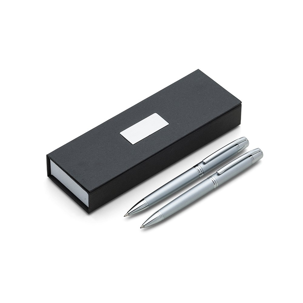 Conjunto caneta e lapiseira em estojo de cartonagem com placa central para personalização. Clip metal com dois anéis em relevo, anel centralizado e dois anéis em relevo na ponteira e acionam por giro. Estojo revestida com espuma na parte interna.