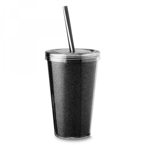 Copo plástico parede dupla 550ml, possuinpersonalização interna de EVA com glitter,ncanudo bicolor biodegradável.