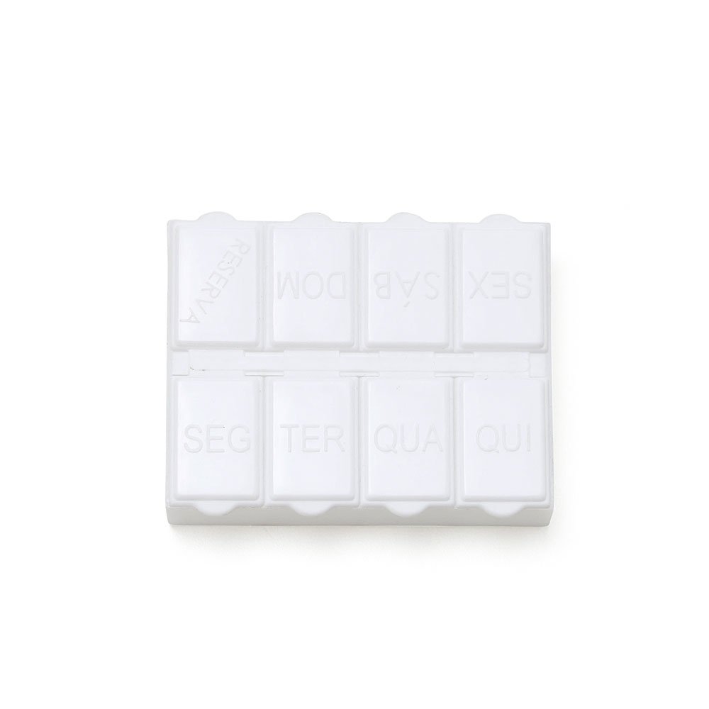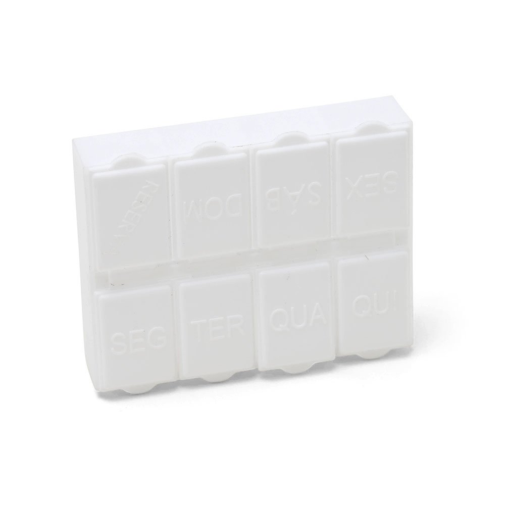 Porta comprimidos semanal de plástico branco fosco. Possui oito divisórias, sete delas escrito em relevo os dias da semana e a última escrito “reserva”. Verso liso. OBS.: PEDIDO MÍNIMO DE 50 PEÇAS!