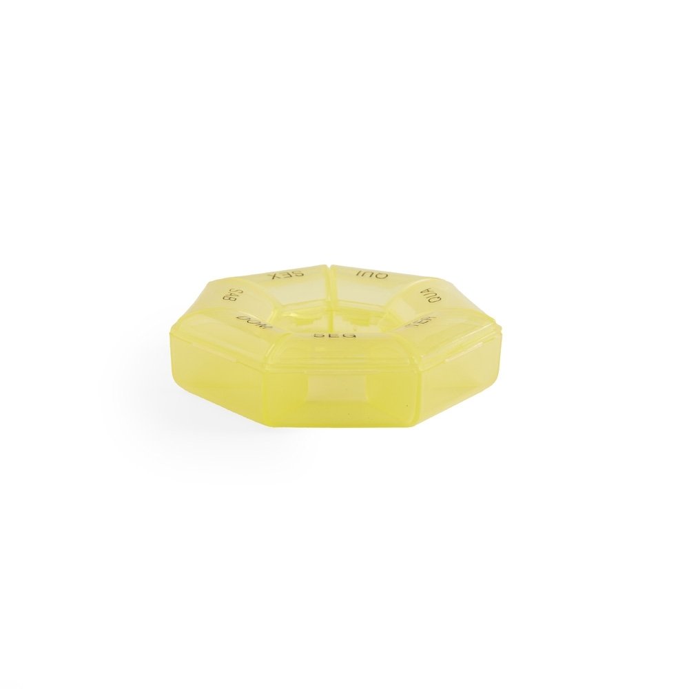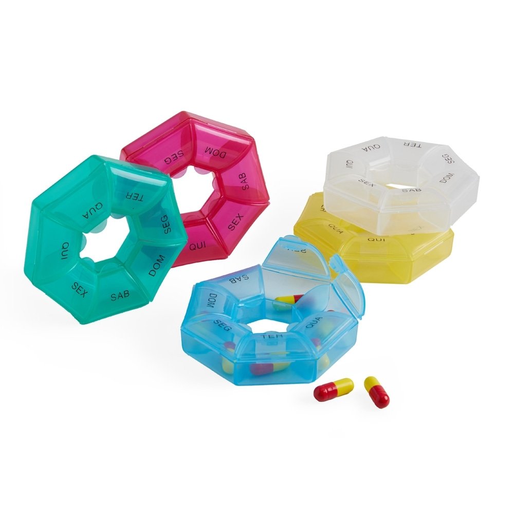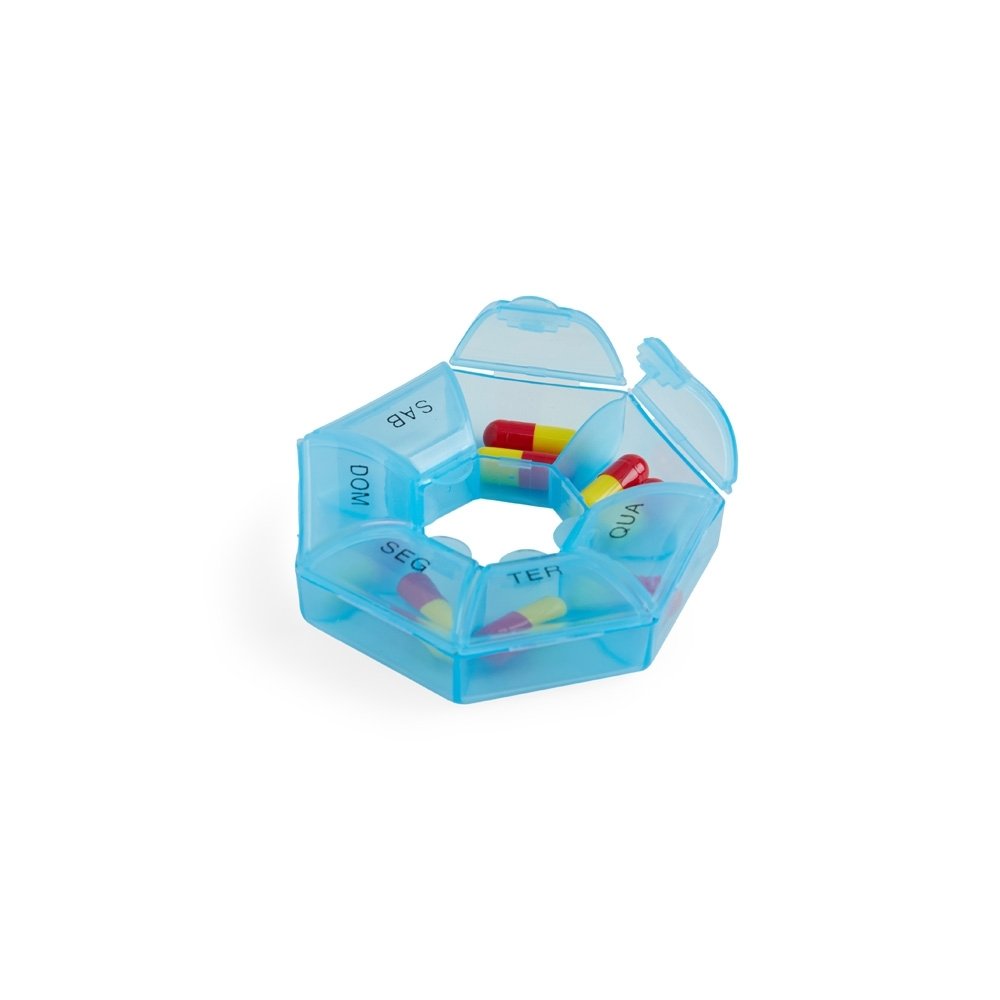 Porta comprimidos semanal, feito em plástico. Largura :  8,6 cm Espessura :  2,2 cm Comprimento :  8,4 cm Medidas aproximadas para gravação (CxL):  1 cm x 3 cm Peso aproximado (g):  17