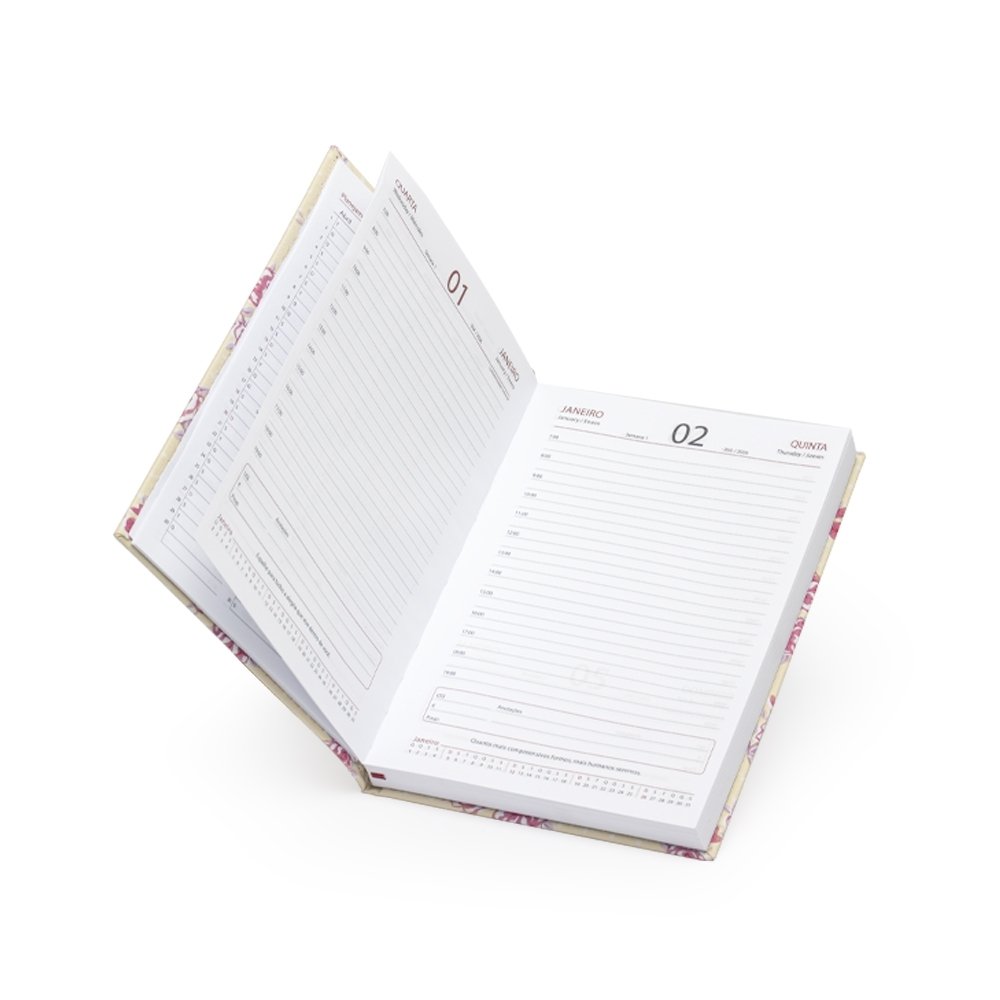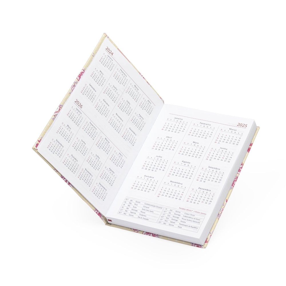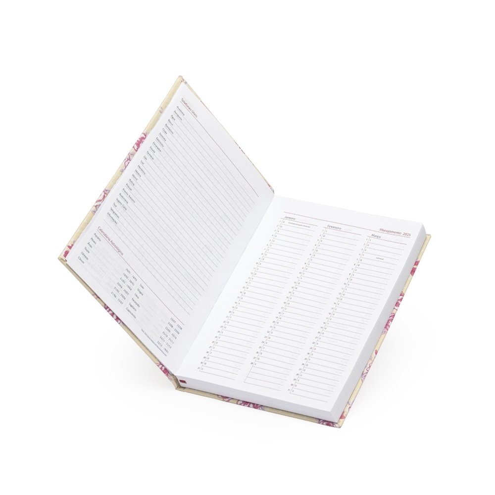 Inicie o ano com organização absoluta com a nossa agenda floral em couro sintético. Esta agenda clássica floral, oferece uma variedade de recursos úteis, incluindo dados pessoais, calendários de 2024 a 2026, mapas, números de telefone essenciais, fita de cetim para marcar páginas favoritas, espaço para planejamentos e aniversariantes, além de códigos de serviços DDD e DDI para facilitar comunicações globais.