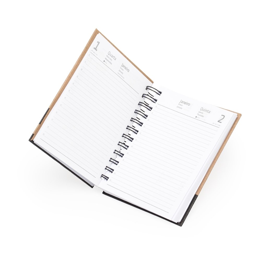 Agenda diária 2025 com espiral, material kraft, capa dura. Contém aproximadamente 169 folhas, entre elas, páginas de dados pessoais, calendário 2024 a 2026, planejamento e aniversários do mês.