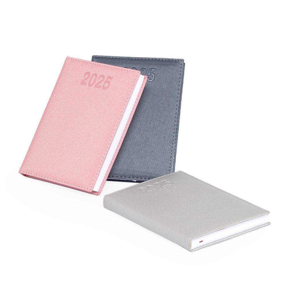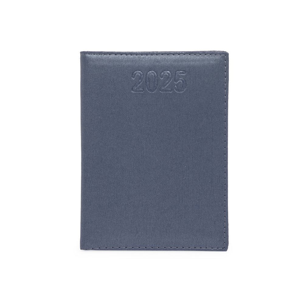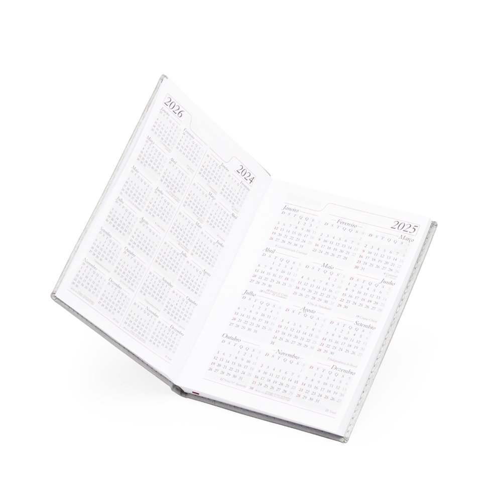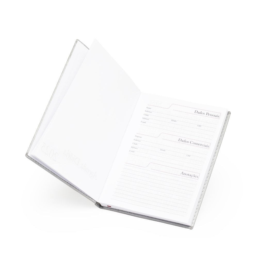 Agenda diária 2025 de couro sintético. Contém fita de cetim marca página, dados pessoais, calendário de 2024 à 2026, mapa do Brasil, mapa-múndi, índice telefônico e planejamento. OBS.: PEDIDOS APENAS MÚLTIPLOS DE 10 PEÇAS! Altura :  20 cm Largura :  14,7 cm Espessura :  2 cm Medidas aproximadas para gravação (CxL):  15,5 cm x 13,5 cm Peso aproximado (g):  371