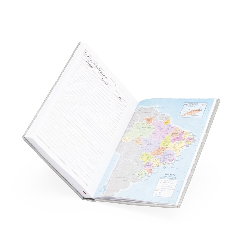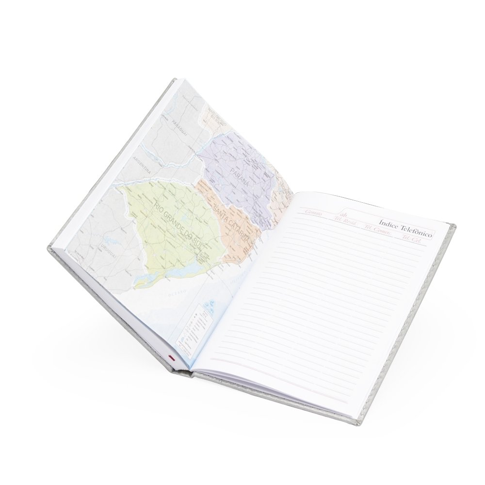 Agenda diária 2025 de couro sintético. Contém fita de cetim marca página, dados pessoais, calendário de 2024 à 2026, mapa do Brasil, mapa-múndi, índice telefônico e planejamento.
