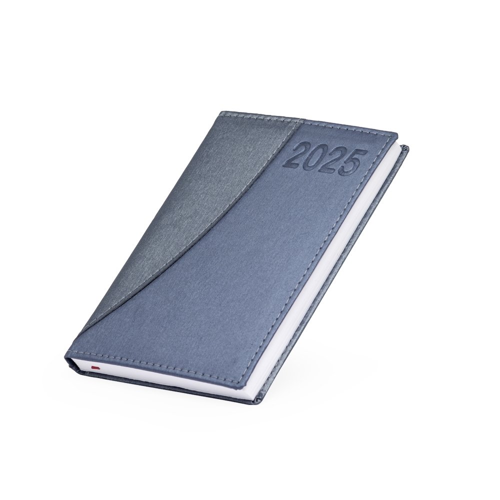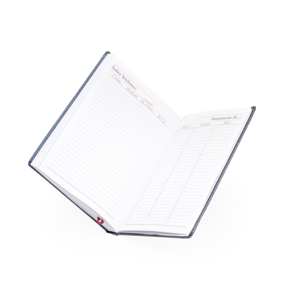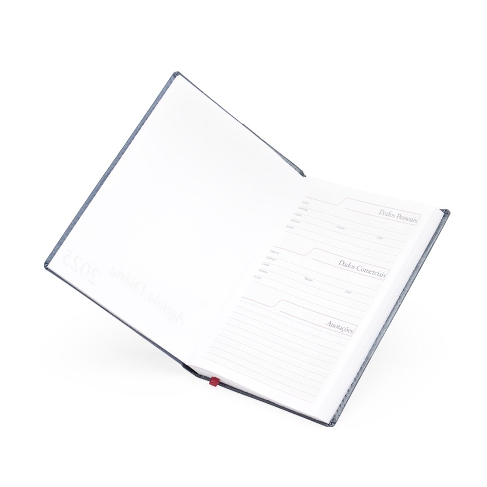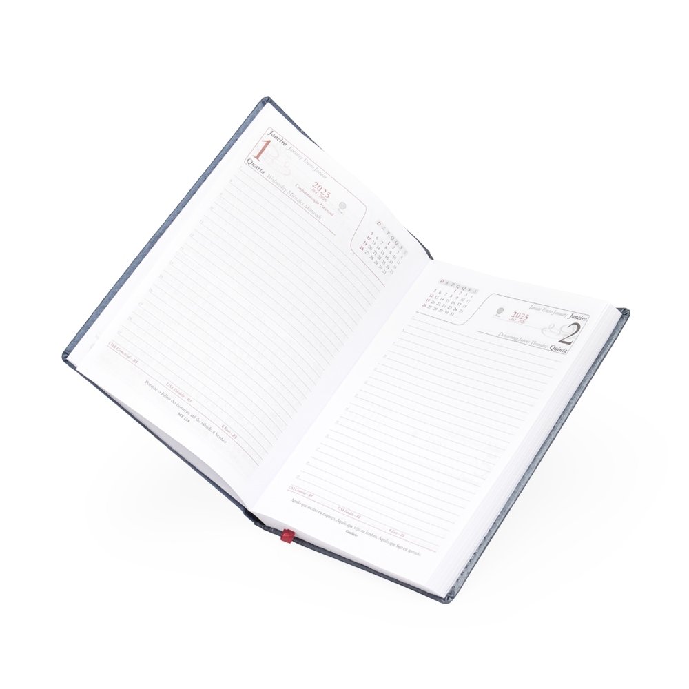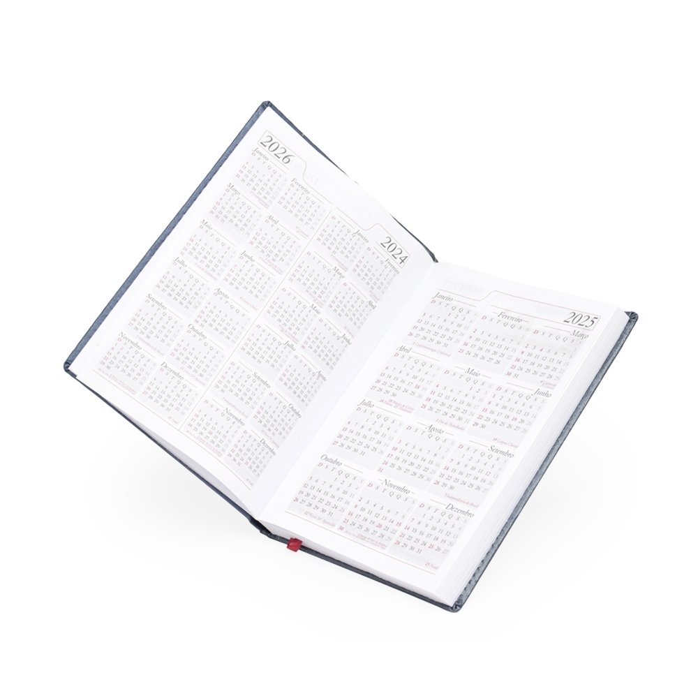 Agenda diária 2025 de couro sintético. Contém fita de cetim marca página, dados pessoais, calendário de 2024 à 2026, mapa do Brasil, mapa-múndi, índice telefônico e planejamento.