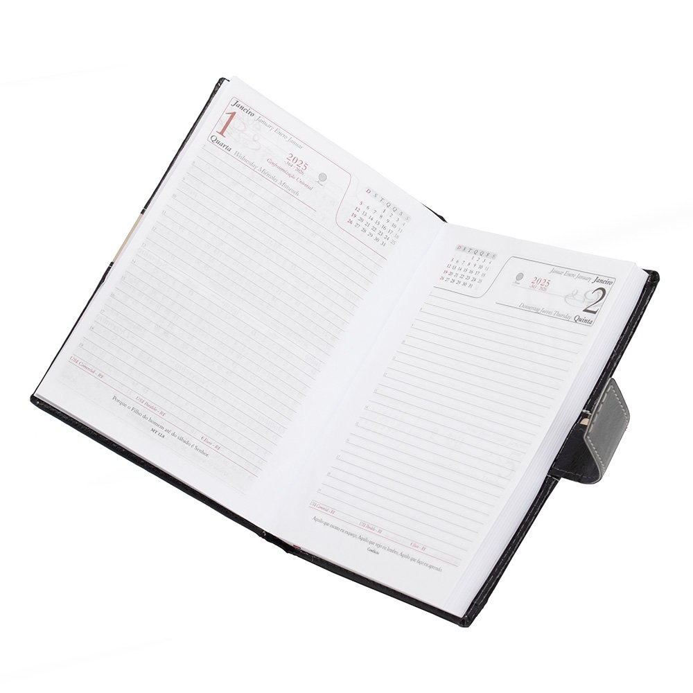 Agenda diária 2025 de couro sintético com fecho e suporte para caneta. Contém fita de cetim marca página, dados pessoais, calendário de 2024 à 2026, endereços da internet, mapa do Brasil, mapa-múndi, índice telefônico e planejamento.OBS.: IMAGEM MERAMENTE ILUSTRATIVA, NÃO ACOMPANHA CANETA!