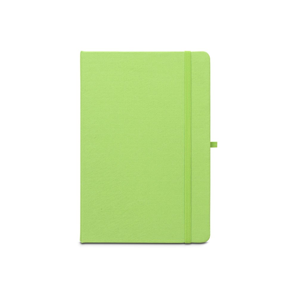 Caderno A5 de capa dura em PET 100% reciclado (rPET) 300D, com cantos redondos. Contém 160 páginas pautadas de cor marfim em papel 100% reciclado, fita separadora, suporte para esferográfica (não inclusa) e elástico para fecho do caderno. Na parte inferior da lombada, tem impresso em branco o símbolo do rPET. 143 x 211 mm