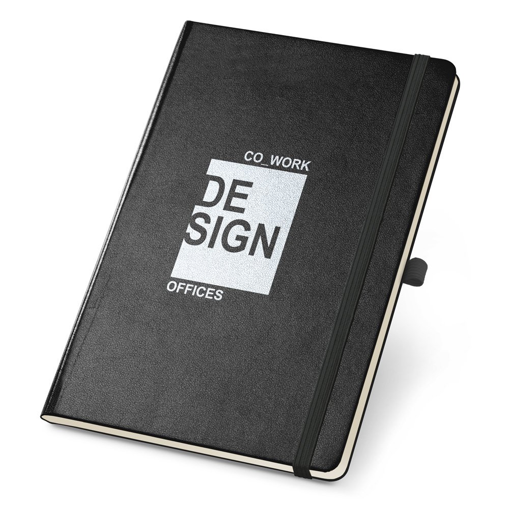 Caderno B6 de capa dura com 160 páginas lisas em cor marfim, suporte para esferográfica (não inclusa) e bolso interior. 120 x 180 mm