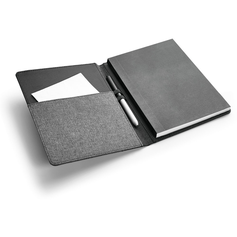 Capa de tecido em poliéster, com caderno A5 removível com 160 páginas lisas. O interior contém um bolso interior e suporte para esferográfica (não inclusa). Fornecida em embalagem de TNT. 160 x 220 mm | Bolsa: 205 x 250 mm