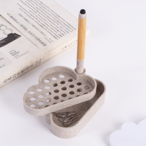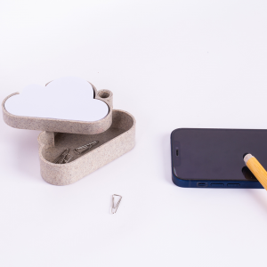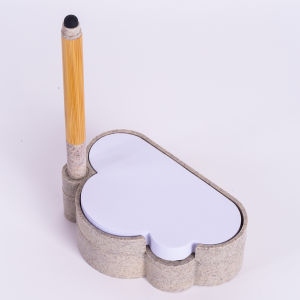Kit escritório, contendo:n1 Bloco de anotações com folhas soltas;1 Caneta em material ecológico;1 Estojo com porta caneta, bloco de anotações e porta clips.Na última folha do bloco de notas encontram-se sementes brancas de camomila para o plantio