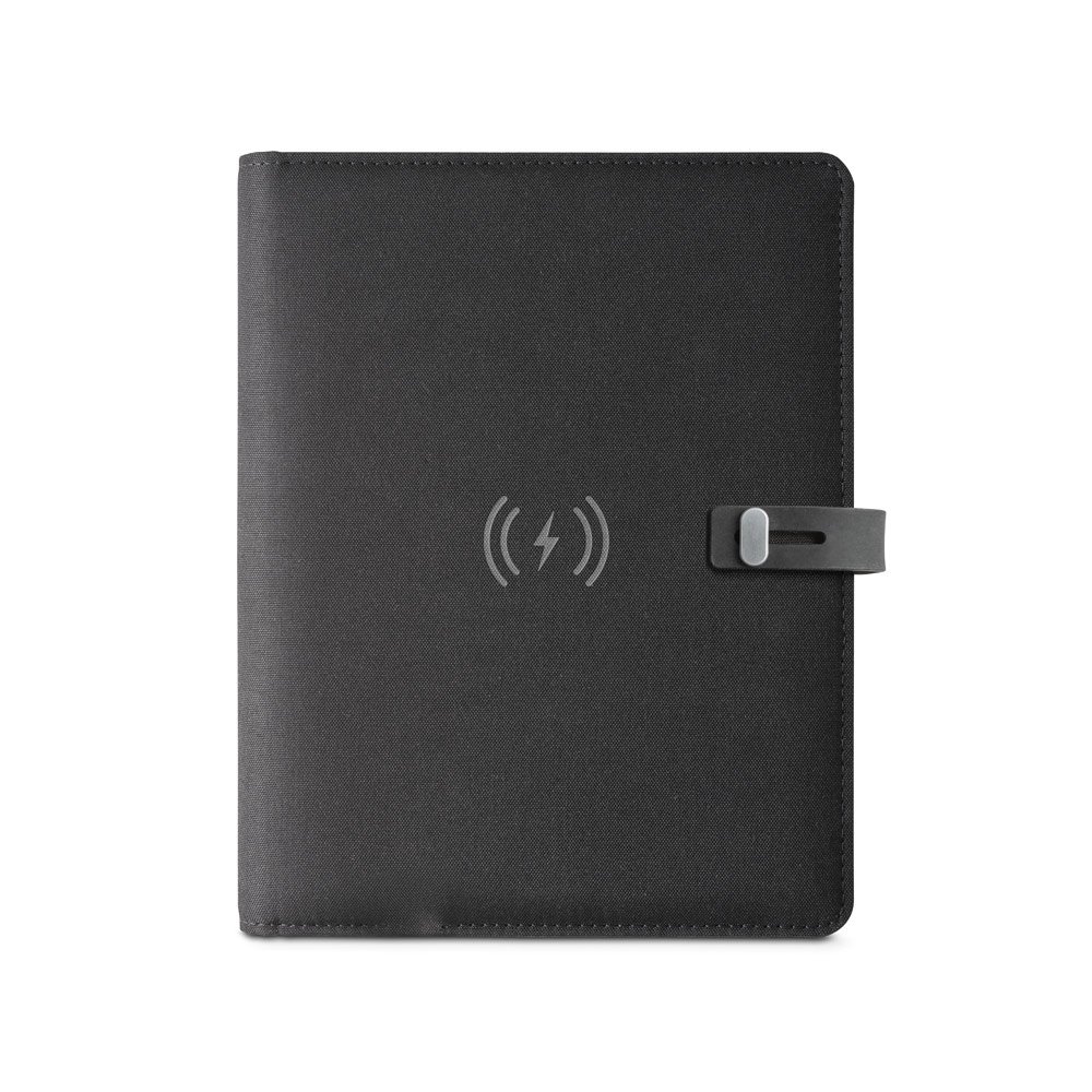 Pasta A5 em 300D poliéster 100% reciclado com carregador wireless embutido. A bateria tem capacidade para 5’000 mAh, potência de 10W, entrada/saída 5V/2’1A e cabo USB tipo C para carregar a bateria. A pasta contém no seu interior um bolso para smartphone até 6’5”, três espaços para cartões, quatro luzes LED, botão on/off, suportes para esferográfica (não inclusa), celular e cabo USB, um bloco de notas com capa em cartão preto e 128 páginas pautadas cor marfim, em papel proveniente de gestão florestal sustentável. Na frente existe ainda uma impressão oval em preto para indicar a área de carga do wireless. Fornecido em caixa presente. 165 x 225 x 25 mm