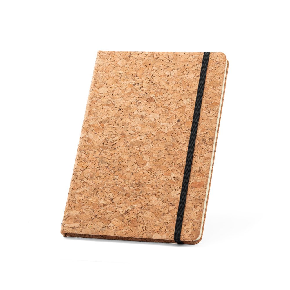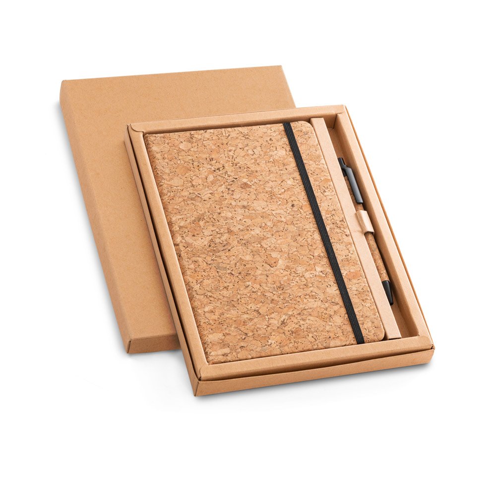 Conjunto decaderno A5 e esferográfica em cortiça. Bloco de capa dura em cortiça, com 192 páginas pautadas cor marfim, em papel proveniente de gestão florestal sustentável. Esferográfica em cortiça de escrita em azul. Fornecido em caixa presente de papel kraft, proveniente de gestão florestal sustentável. A cor e o resultado da impressão nos materiais naturais pode variar entre produtos. 140 x 210 mm
