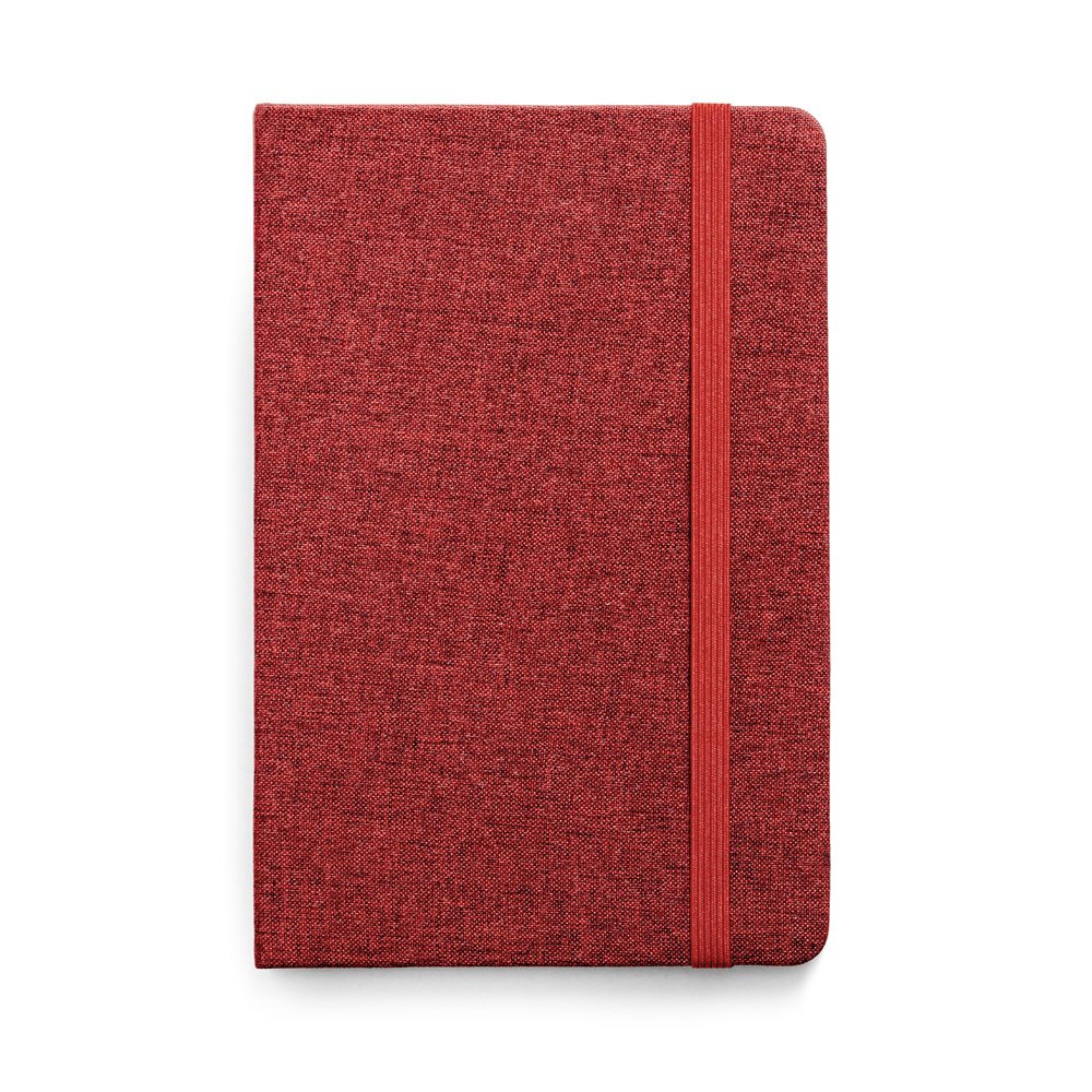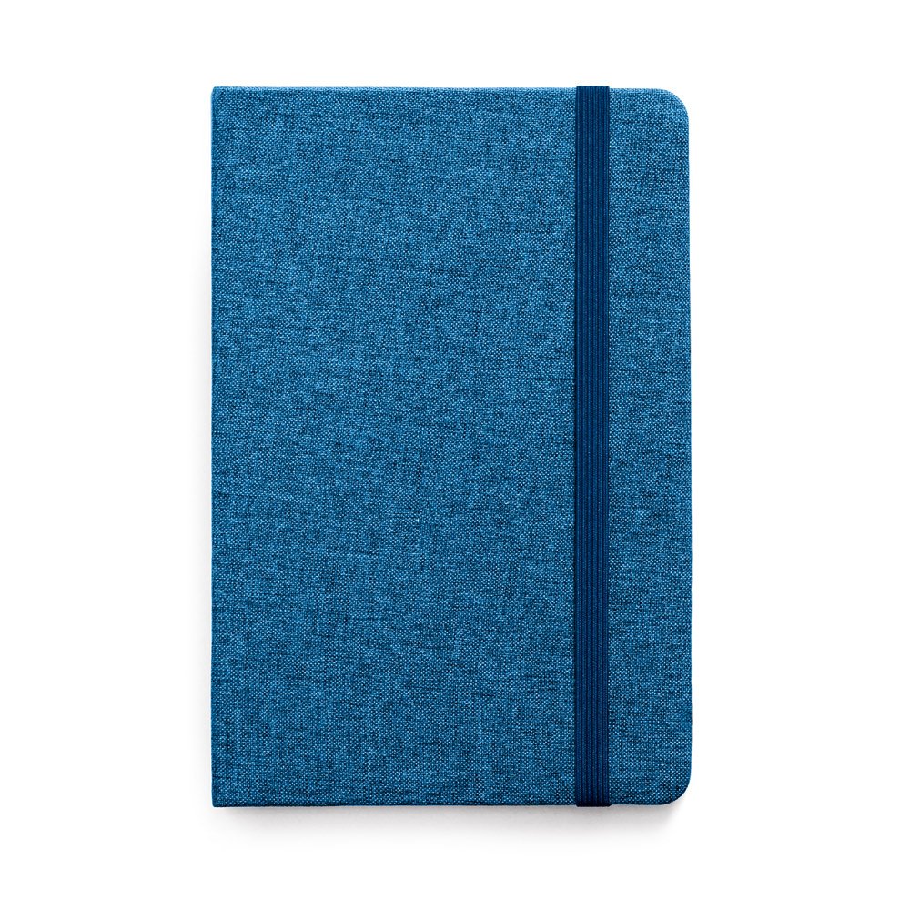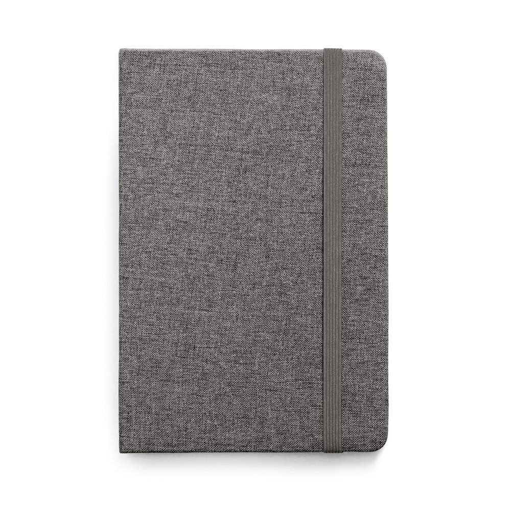 Caderno A5 com capa dura forrada em tecido poliéster e 160 páginas pautadas em cor marfim. Contém elástico e fita separadora. 137 x 210 mm