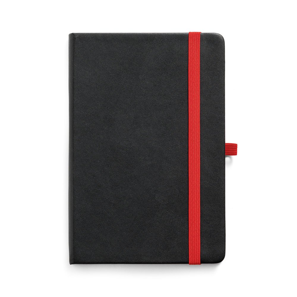 Caderno A5 de capa dura em PU com substrato colorido permitindo a gravação a laser da cor do elástico. Contém 160 páginas pautadas, elástico, fita separadora, suporte para esferográfica (não inclusa) e bolso em papel na parte traseira da capa. 140 x 210 mm