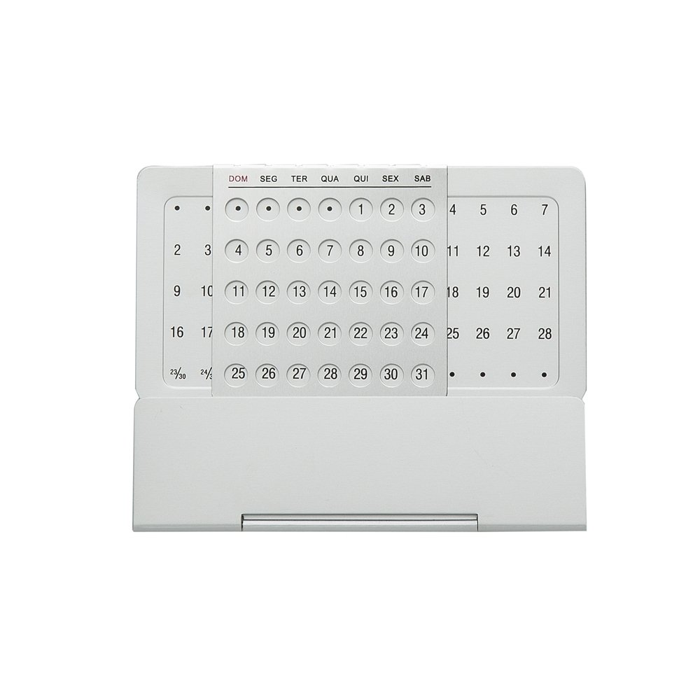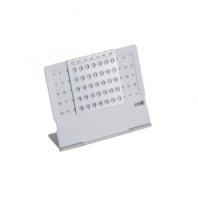 [vc_row][vc_column width=”2/3″]n[vc_column_text]Calendário permanente de metal com base dobrável. Possui chapa de metal com trinta cinco furos(personalizado na parte superior os dias da semana)e mecanismo giratório na parte traseira com os meses. n n n n n n Medidas aproximadas para gravação (CxL):  3 cm x 8,7 cmn Tamanho total aproximado  (CxL):  8,8 cm x 10,5 cmn Peso aproximado (g):  30n