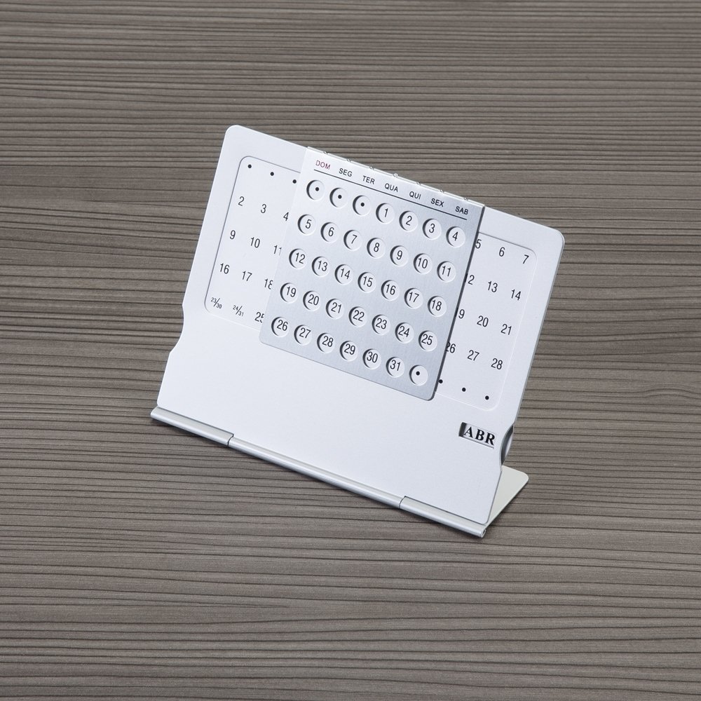 Calendário permanente de metal com base dobrável. Possui chapa de metal com trinta cinco furos(personalizado na parte superior os dias da semana)e mecanismo giratório na parte traseira com os meses.
