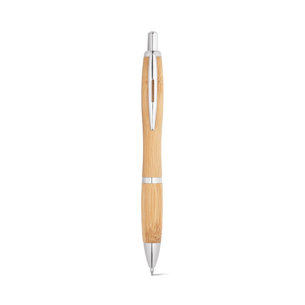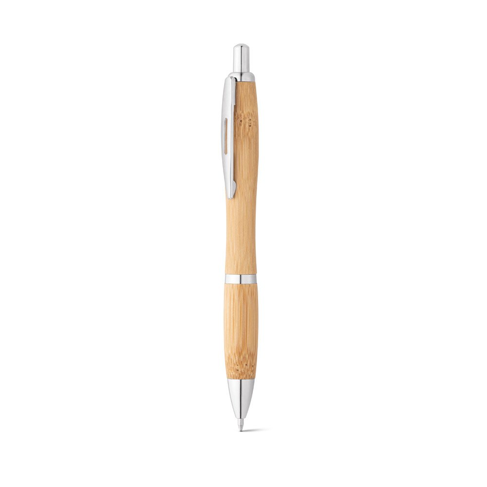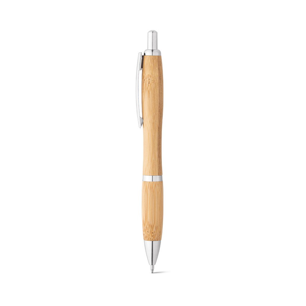 Esferográfica em bambu com clipe de metal. Escrita em preto até 1.5 km. A cor e o resultado da impressão nos materiais naturais pode variar entre produtos. ø13 x 143 mm