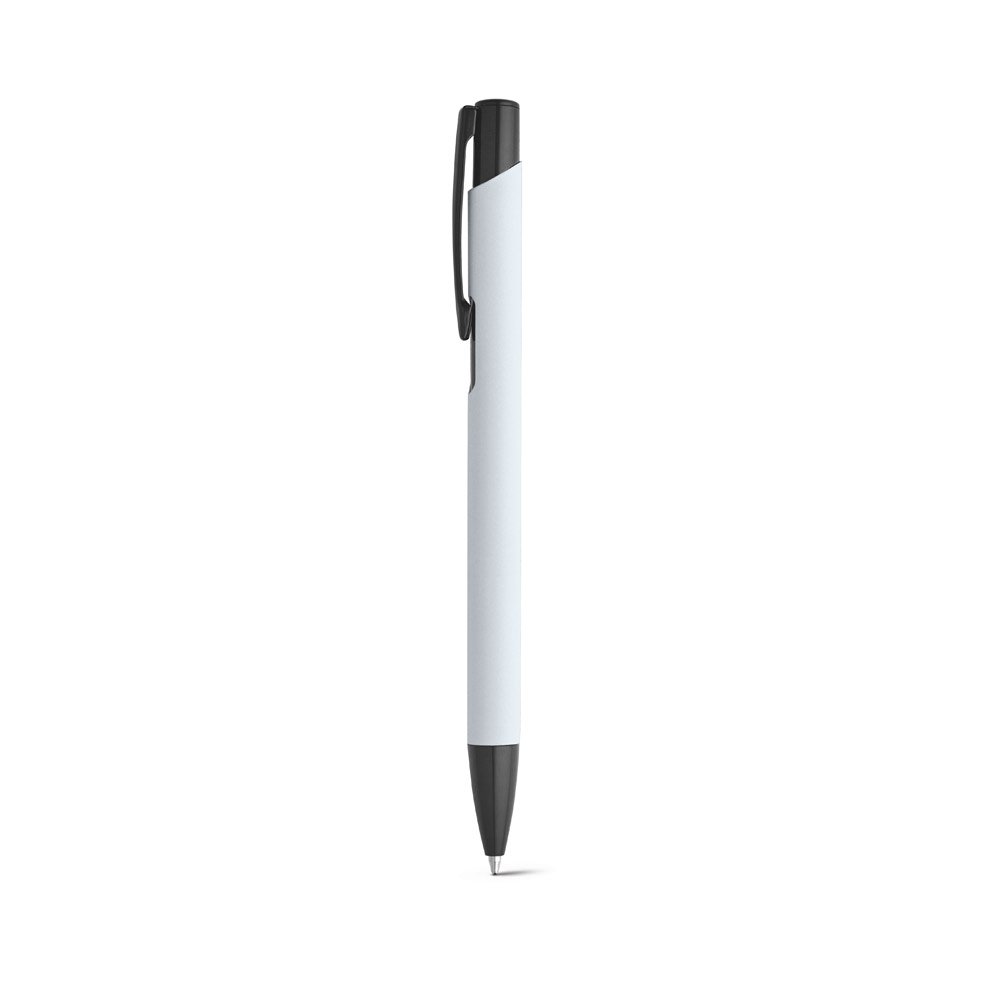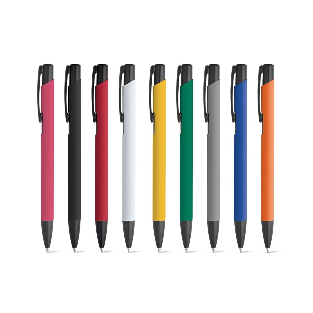 Esferográfica em alumínio com corpo colorido, acabamento emborrachado e clipe de metal. Escrita em preto até 1.5 km. ø10 x 137 mm