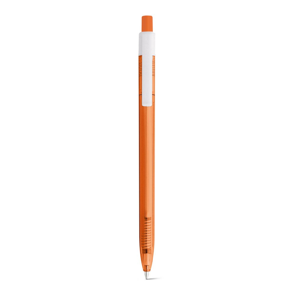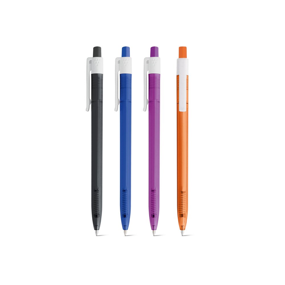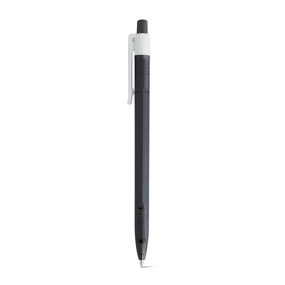 Esferográfica em ABS com acabamento translúcido e clipe branco. Até 1.5 km de escrita. ø9 x 140 mm
