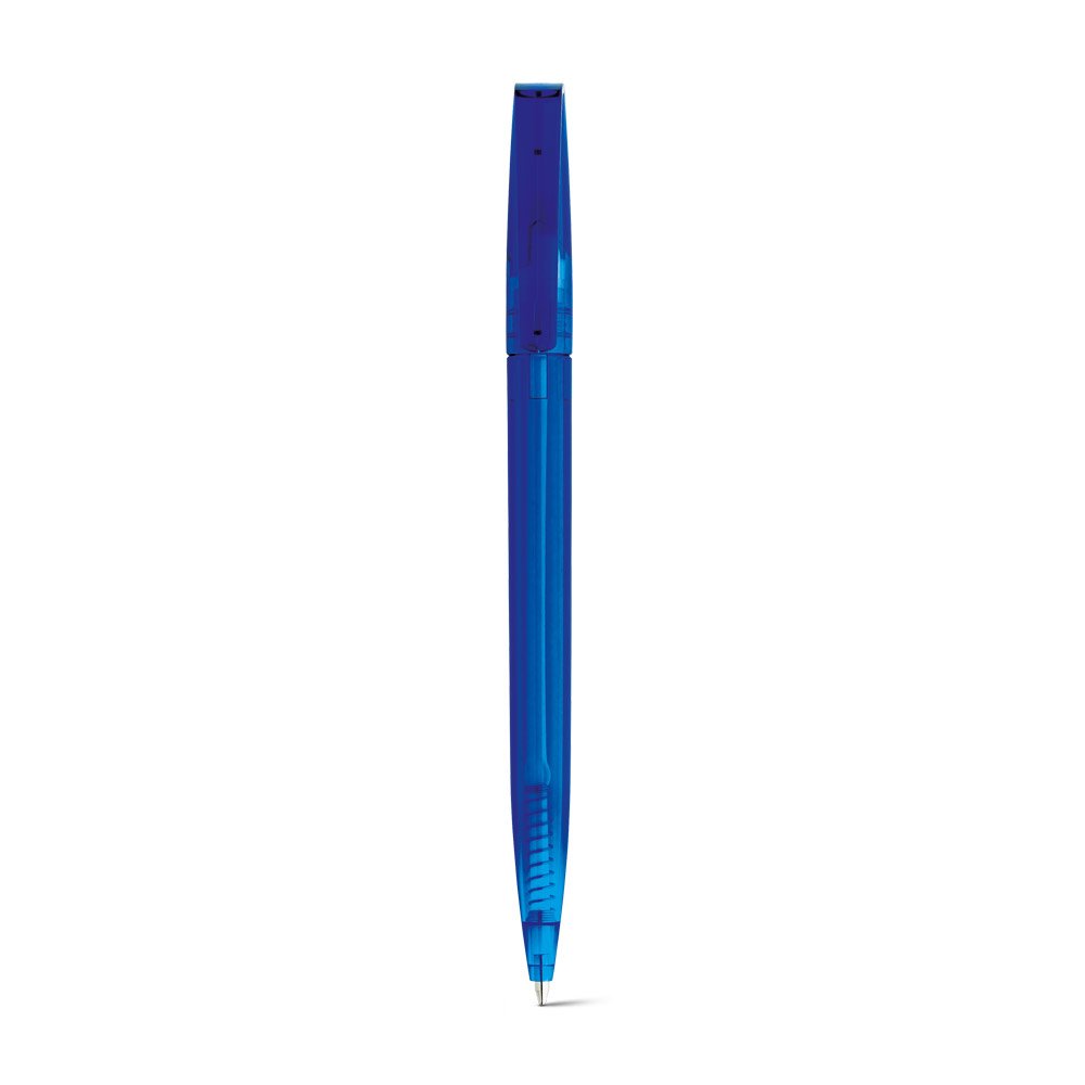 Esferográfica em ABS com acabamento translúcido e mecanismo twist. Escrita em preto até 1.5 km. Produto certificado de acordo com a portaria Inmetro nº423 de 8/out/2021. ø10 x 136 mm