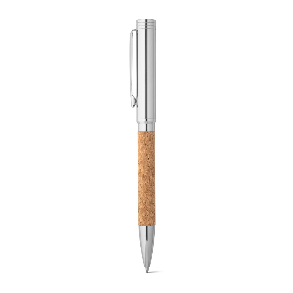 Esferográfica com corpo em cortiça e clipe de metal. Possui mecanismo twist e escrita em azul até 1.5 km. Fornecida numa bolsa presente de cortiça. A cor e o resultado da impressão nos materiais naturais pode variar entre produtos. ø11 x 137 mm | Bolsa: 155 x 40 mm