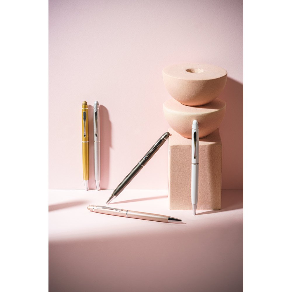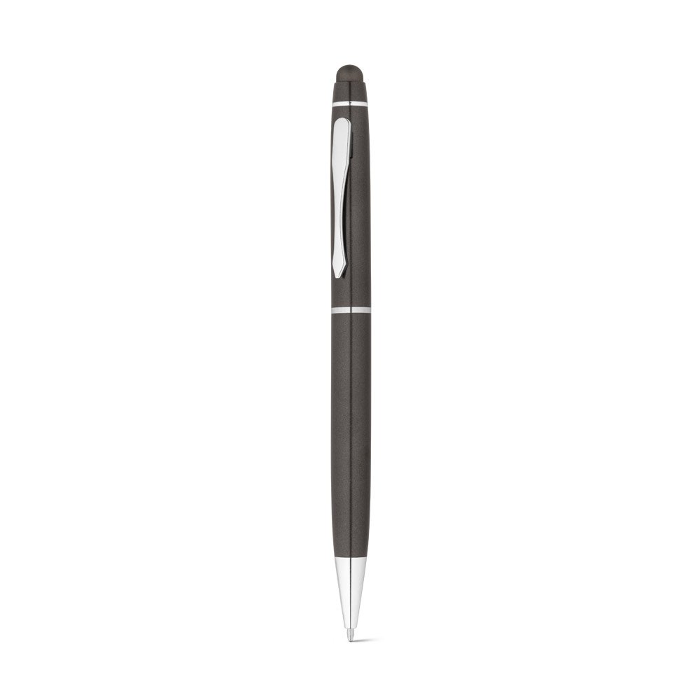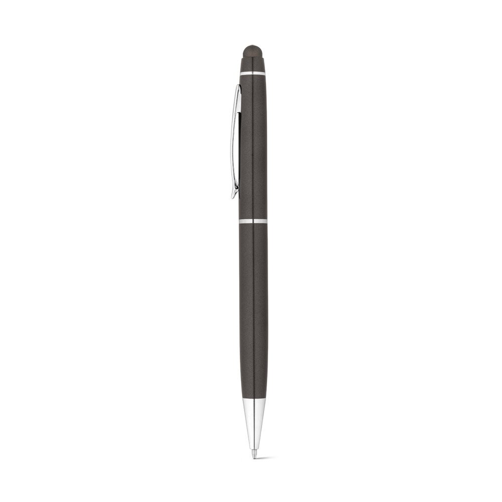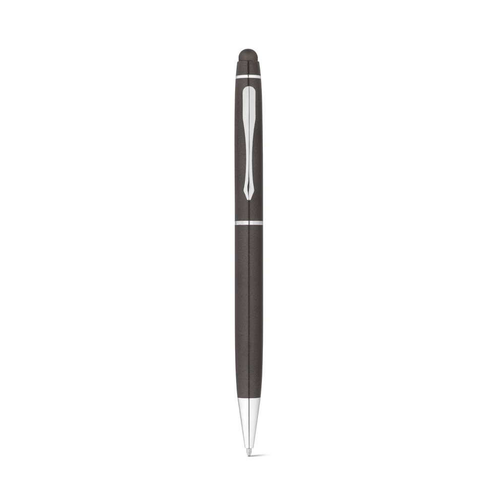 Esferográfica em alumínio com ponteira touch e mecanismo twist. Escrita em azul até 1.5 km. Fornecida com estojo de oferta desmontado. ø10 x 141 mm | Estojo: 150 x 15 x 19 mm