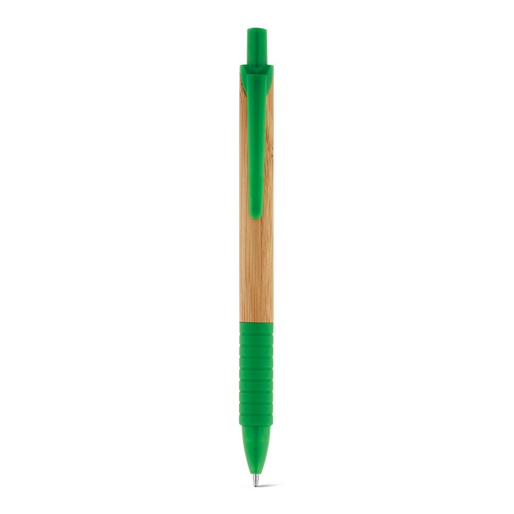 Esferográfica em bambu com antideslizante, clipe e ponteira de plástico. Escrita em preto. A cor e o resultado da impressão nos materiais naturais pode variar entre produtos. ø11 x 142 mm