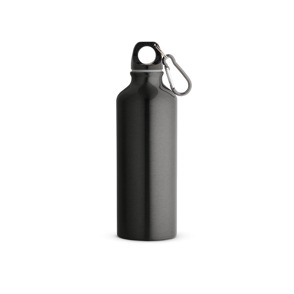 Squeeze em alumínio com mosquetão para fácil transporte. Capacidade até 530 mL. Caixa branca 94656 vendida opcionalmente. Certificação EU Food Grade. ø66 x 210 mm