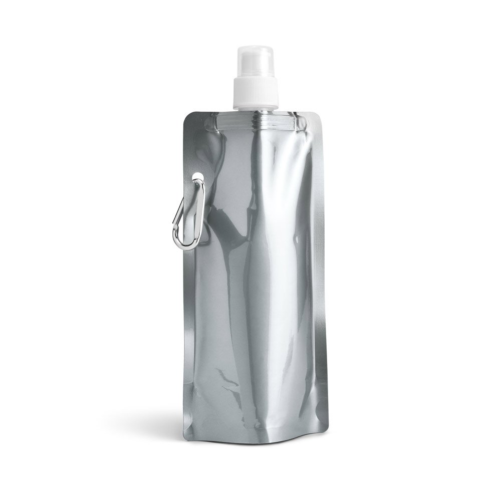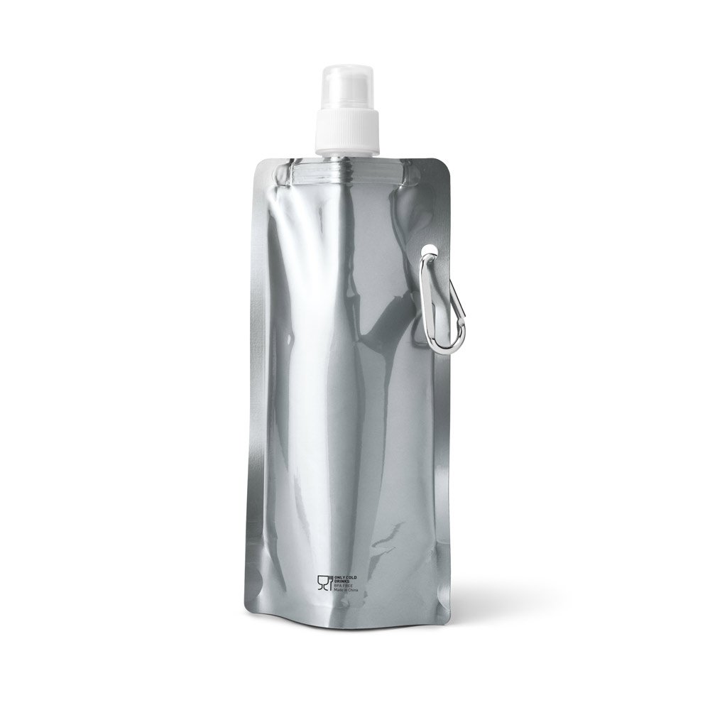 Squeeze dobrável em PE com bico de sistema “push-pull” e acabamento metalizado. Contém uma tampa transparente e um mosquetão para fácil transporte. Capacidade até 460 mL. Certificação EU Food Grade. 110 x 218 x 64 mm