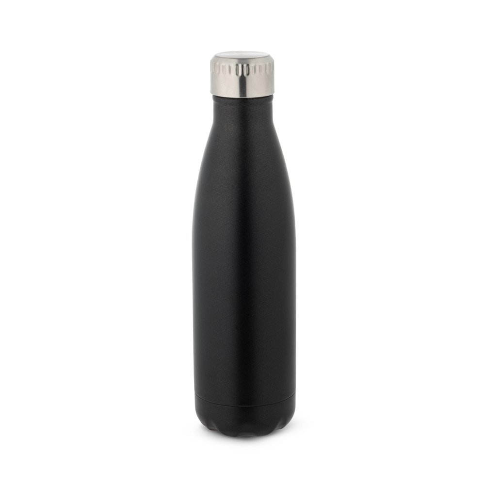 Garrafa em aço inox de parede dupla térmica, isolada a vácuo, com tampa em aço inox. Capacidade até 500 mL. Preserva as bebidas quentes por 8h e frias por 24h. Fornecido em caixa presente. Certificação EU Food Grade. ø71 x 255 mm