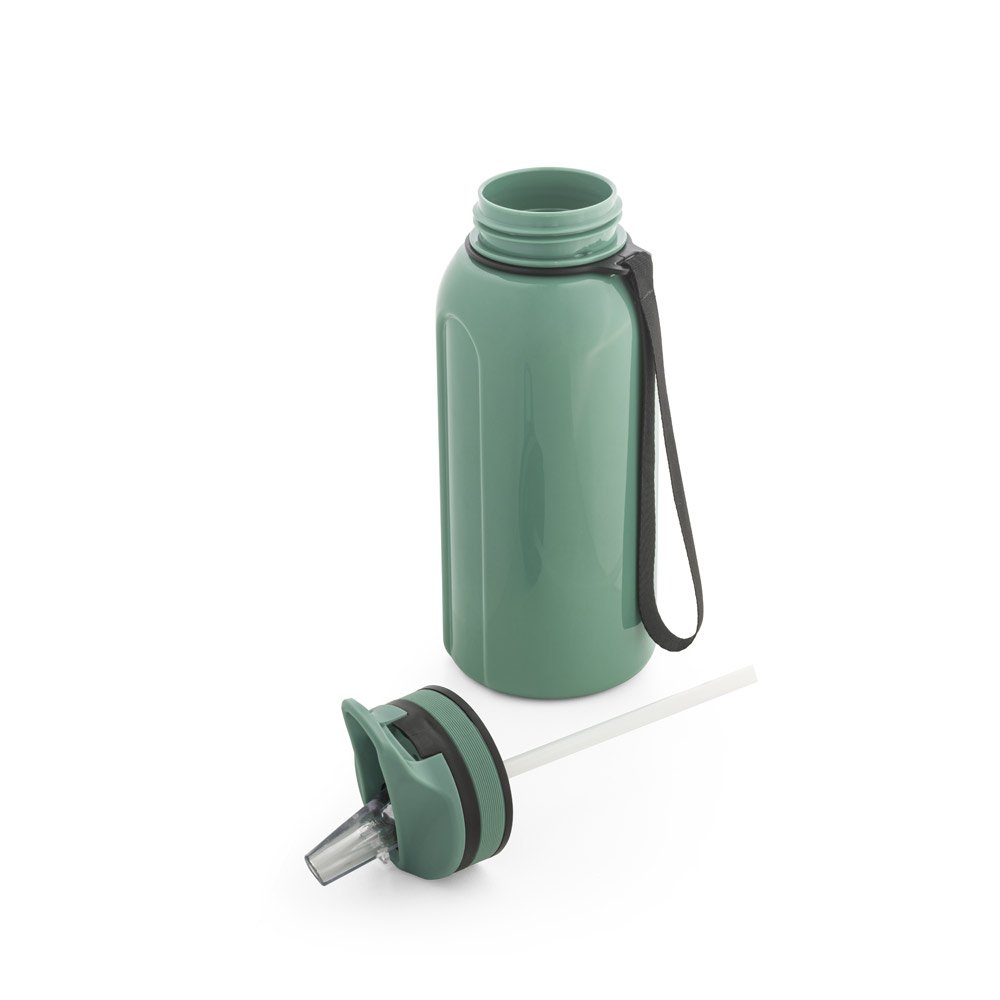 Squeeze esportiva em PETG, tampa com bico de canudo flip e canudo flexível no interior, com pega para facilitar o transporte. Grande capacidade até 1230 mL. Certificação EU Food Grade
