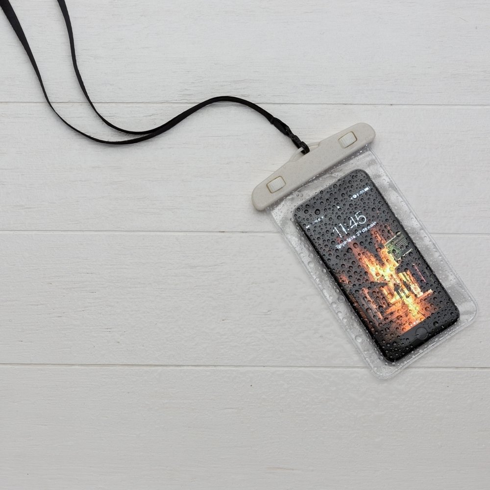 Case impermeável universal para smartphones com cordão de nylon de tamanho regulável.