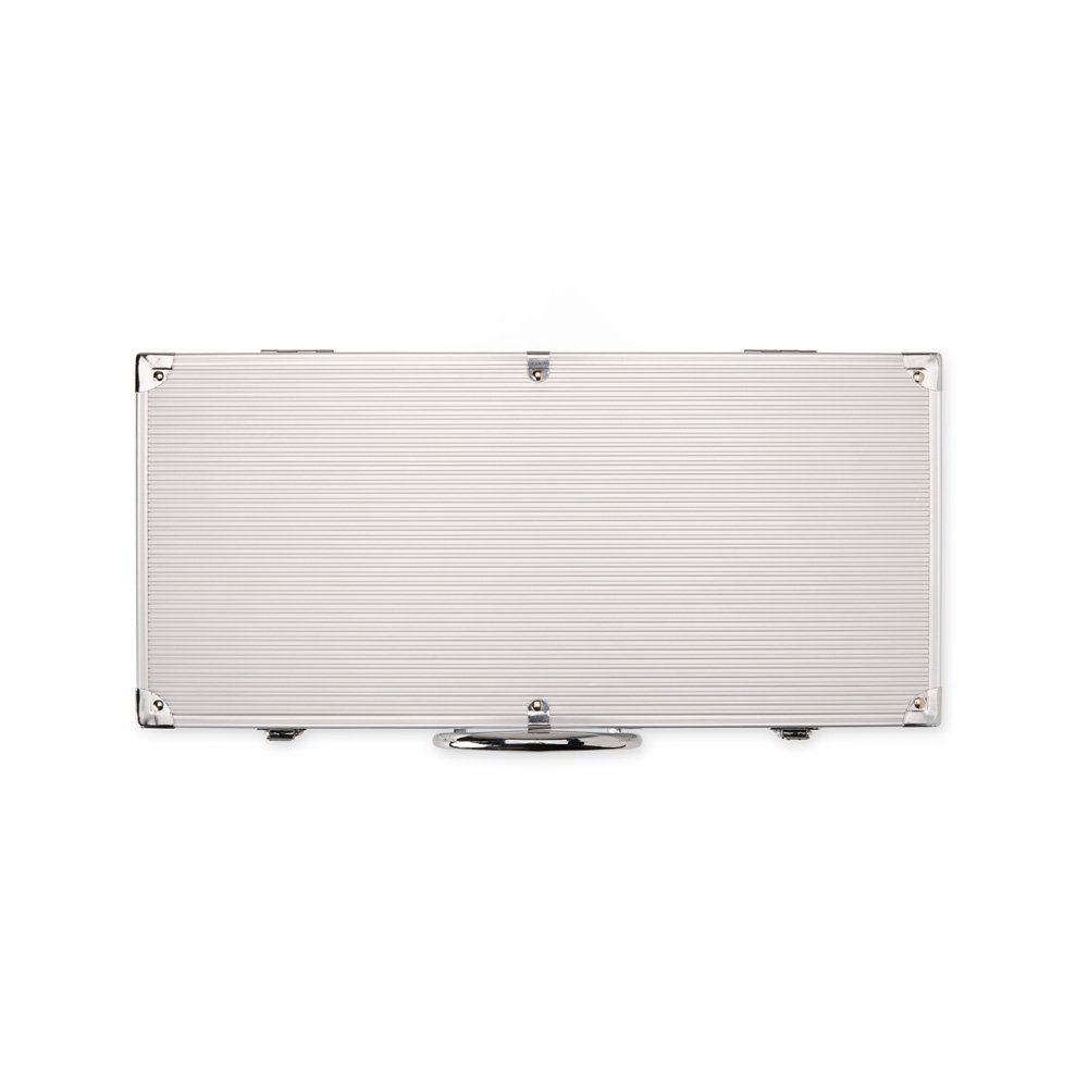 Kit churrasco 10 peças em maleta de alumínio com travas de segurança e placa central para personalização. Contém: espátula, pegador, escova para grelha, faca, pincel, garfo e quatro espetos, parte interna da maleta com revestimento em TNT e suportes de velcro para fixação das peças.
