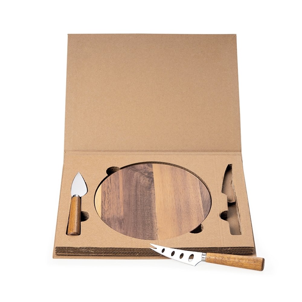 Kit queijo 3 peças em estojo kraft, contém: tábua de madeira redonda, faca com ponta, e faca vazada com ponta. Tábua com orifício para encaixe.