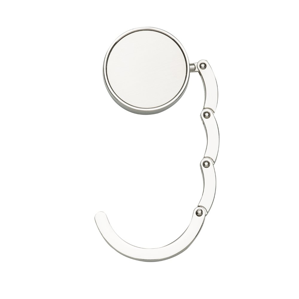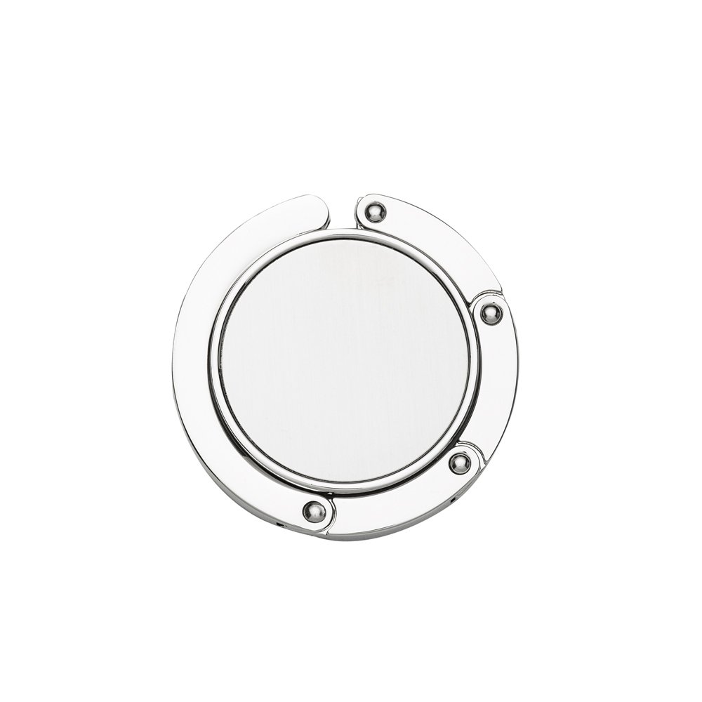 Porta bolsa de metal dobrável, possui chapa central redonda para gravação e parte traseira borracha anti deslizante. Para utilizar o porta bolsa basta puxar a lateral(é imantado) e abri-lo. Medidas aproximadas para gravação (CxL):  2,9 cm x 2,9 cm Tamanho total aproximado  (CxL):  4,4 cm x 4,4 cm Peso aproximado (g):  40