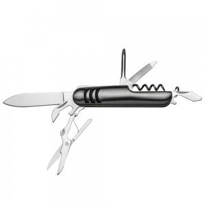 Canivete metal 7 funções com detalhes emborrachados preto(três linhas frente e verso). Possui: lâmina de corte, mini tesoura, abridor de lata, abridor de garrafa, chave phillips, lixa e saca rolhas. Acompanha bainha de nylon.